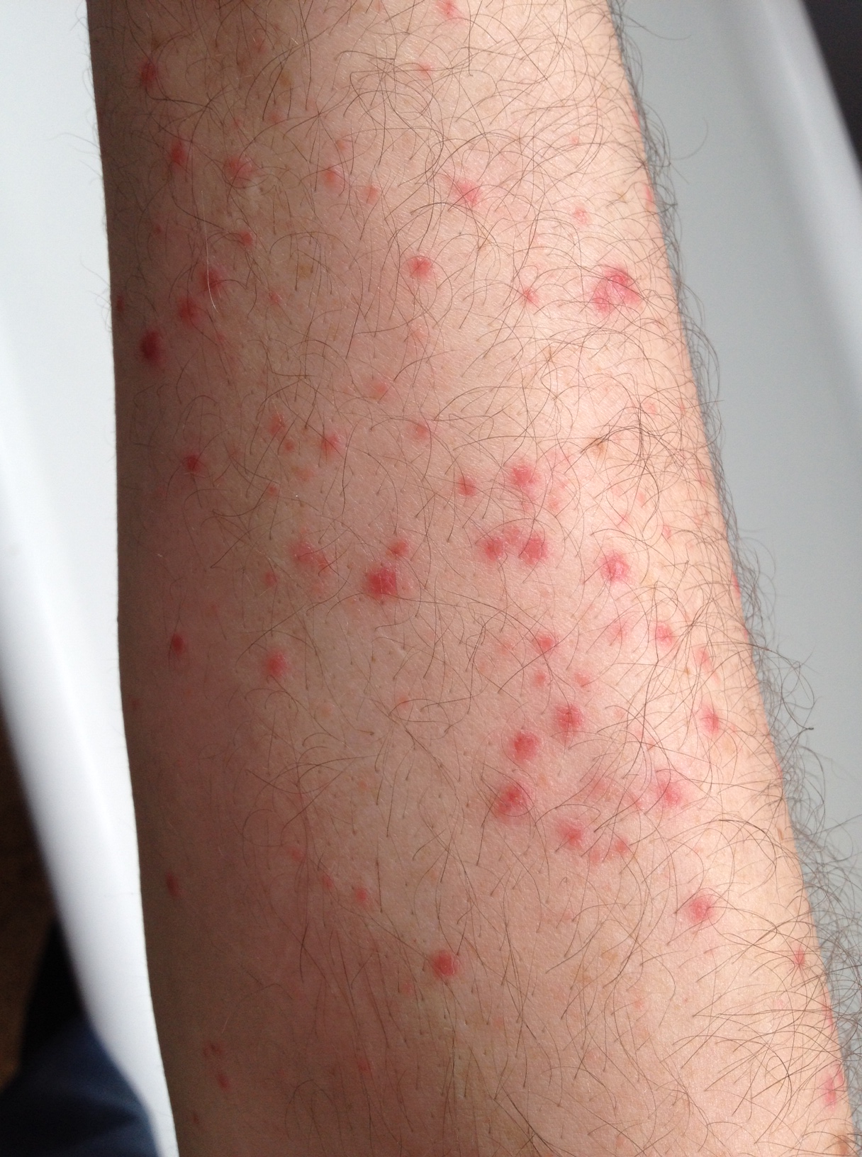So, Friday comes, and I’m still feeling great, but around lunch I noticed I had some weird red spots on my arm. Then I noticed I had weird red spots on my stomach. Then I went online to search for what it could be. Red spots can be a side effect of taking Amoxicillin, the drug anti-biotics I was on for the strep throat. It results in little red marks about 1mm in diameter. I went to the walk-in-clinic and the doctor confirmed that’s what it was, and suggested I take something like Reactin, or Claritin, because it would reduce the inflammation. A few days later it hadn’t gotten any better, only worse, so I called up my friendly dermatologist and made an appointment to see him.